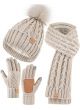 - Womens Beanie Hat Scarf Gloves Set, Soft Fleece Lined Winter Hat with Pom Pom, Long Knit Scarf Neck Warmer Touchscreen Gloves for Cold Weather, 3 In 1 Warm Set Oatmeal
